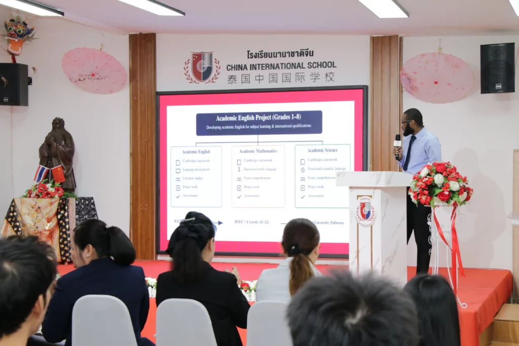 งานในครั้งนี้ได้รับเกียรติจาก อาจารย์ ดร.เสาวภาคย์ แหลมเพ็ชร ผู้อำนวยการโรงเรียน เป็นประธานกล่าวเปิดงานและนำเสนอวิสัยทัศน์การปั้นเยาวชนให้พร้อมสู่โลกยุคใหม่ โดยไฮไลท์สำคัญคือการบรรยายพิเศษจาก คุณธนเดช กิจศุภไพศาล ผู้อำนวยการกลุ่มสถาบันภาษาจีน สำนักงานคณะกรรมการการศึกษาขั้นพื้นฐาน กระทรวงศึกษาธิการ ที่มาให้ความรู้ในหัวข้อ:ระดับประถมศึกษา: “ปั้นรากฐานอัจฉริยะสร้างความสุขในการเรียนรู้” ระดับมัธยมศึกษา: “เจาะลึกเส้นทางสู่มหาวิทยาลัยชั้นนำด้วยหลักสูตร CSCA” เจาะลึกหลักสูตรและกิจกรรมการเรียนรู้